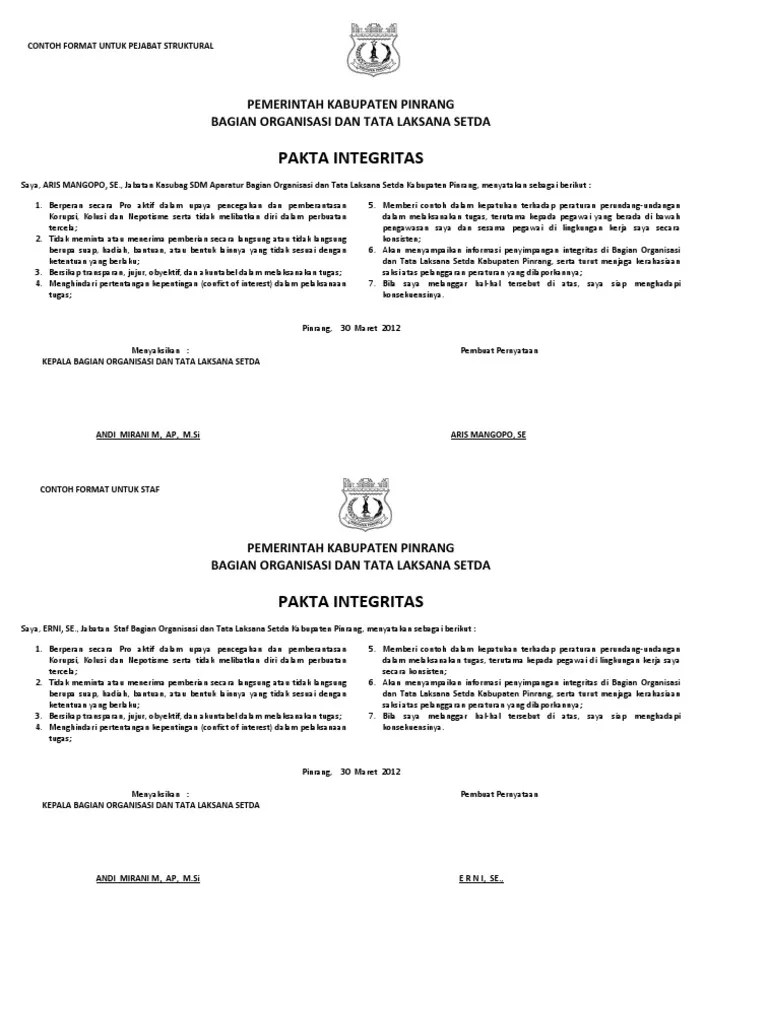 Direktur) yang tercantum dalam akte perusahaan. Mencantumkan klausul dalam syarat khusus kontrak tentang janji integritas oleh kontraktor/supplier . Berikut ini beberapa contoh lain kecurangan yang dilakukan kpu. (10) format pakta integritas penjualan minuman beralkohol. Pendeklarasian pakta integritas di komisi pemilihan umum.